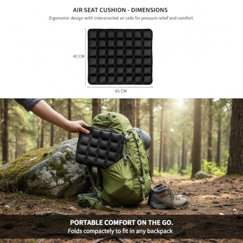 - Ergonomically Designed Travel Seat Cushion: This cushion is ergonomically designed to relieve pressure on the coccyx, tailbone, and hips, helping improve posture, reduce fatigue, and promote blood circulation.The higher outer air cells gently support the hips and thighs for stability, while the air cells gradually lower towards the center to create a pressure-relief zone. The air structure evenly distributes body weight, reducing pressure on the coccyx area and supporting natural spinal alignment for enhanced comfort.