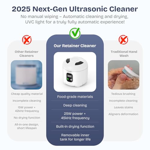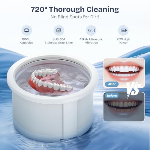 - 45kHz Ultrasonic Cleaning with 25W Power: High-frequency 45kHz ultrasonic waves combined with 25W output create dense bubbles that help remove surface buildup from retainers, dentures, aligners, mouthguards, and jewelry providing a thorough and gentle cleaning experience.