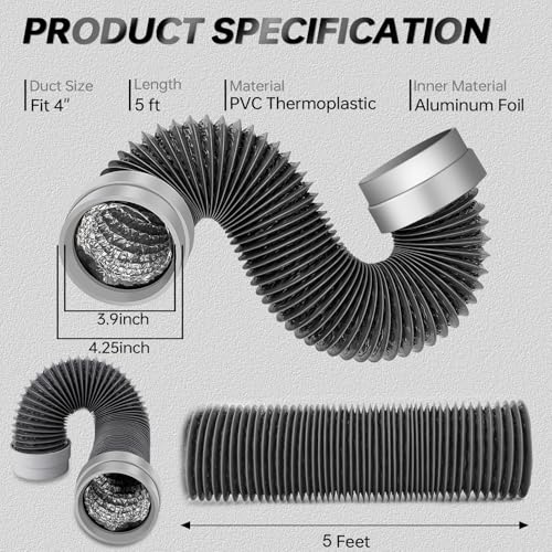 - [VERSATILE 4 INCH DRYER VENT TUBE]: This 4 dryer vent hose extends up to 5 feet while maintaining full 4-inch diameter for maximum airflow efficiency.Our dryer duct connector system fits vents from 3.95-4.15 inches, compatible with most standard dryer setups –ideal for all dryer vent hose connector needs.