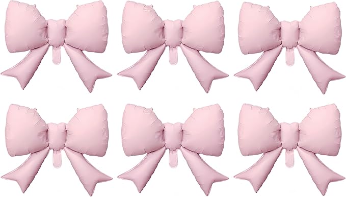 Includes 6 pink bow balloons, 1 inflatable straw, and 1 roll of 10-meter ribbon; medium bows are not helium-flyable.