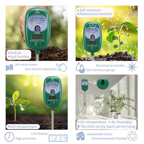 - 7 functions,Scientific maintenance: The soil testing kit is more suitable for beginners, and can help you comprehensively understand the soil conditions of gardens and lawns, solving your confusion. You can adjust soil moisture and pH according to the values, and you can also clearly see the air temperature and humidity as well as soil temperature through the LCD display to improve plant growing conditions in time and scientifically nurture seedlings to help you make your plants flourish.