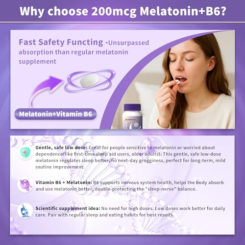 - Dual-Action Sleep Support: Our formula combines low-dose melatonin (200mcg) with vitamin B6 to gently regulate your sleep-wake cycle. Melatonin eases you into restful sleep, while B6 helps convert nutrients to support calmness, making it best ideal for occasional sleeplessness or jet lag.