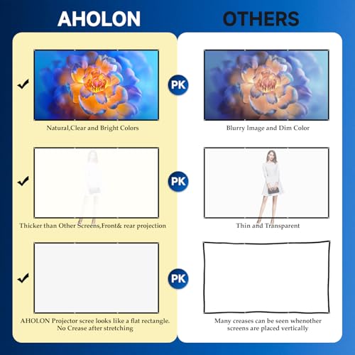 - Thickened projector screen:100 inch projector screen 16:9 aspect ratio 160 degree viewing Angle 4K Ultra HD.The outdoor projector screen is made of high-quality milk silk,Thicker than other regular screens,Washable and soft,Easy to clean.Wrinkle resistant design for more fun,Support for front and rear projector screen.
