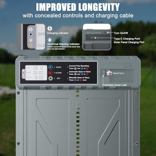 - Hidden Charging Cable for Longevity: The charging cable is concealed to prevent damage from curious chickens, extending the coop door’s lifespan