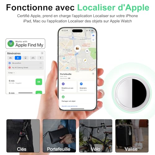 - ?Alarme Puissante & Localisation Mondiale via le Reseau Apple?Notre traceur integre une sonnerie puissante allant jusqu’a 100 dB, vous permettant de retrouver rapidement vos objets a proximite. Pour une localisation mondiale, utilisez simplement l’application Apple “Localiser” (Find My) ou demandez directement a “Siri”. Grace au vaste et securise reseau “Localiser”, vos biens sont detectables partout dans le monde des qu’un appareil Apple se trouve a portee Bluetooth de votre traceur