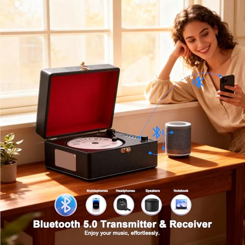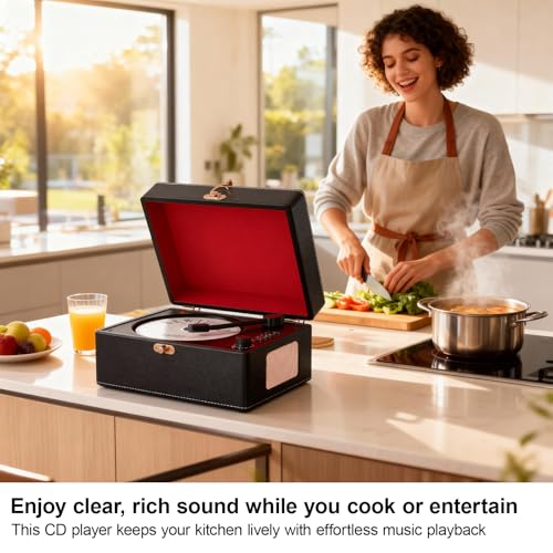 - ?Vintage Leather Case? The meticulously crafted vintage portable leather case combines with Vintage CD player featuring a unique rotating arm switch design, reminiscent of a classic phonograph, seamlessly blending wonderful music with vintage style, adding texture and sophistication to your auditory experience.