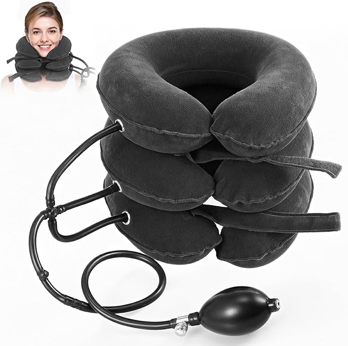 This adjustable inflatable cervical traction device gently stretches and supports the neck to relieve tension, stiffness, and pain caused by poor posture, pinched nerves, or herniated discs.