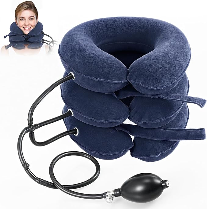 This adjustable inflatable cervical traction device gently stretches and supports the neck to relieve tension, stiffness, and pain caused by poor posture, pinched nerves, or herniated discs.