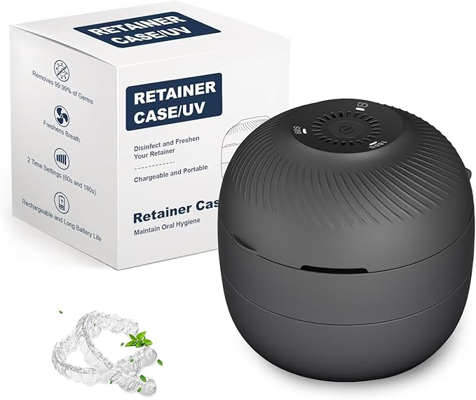 This 4-in-1 retainer case features a lower soaking box for soaking and storing your retainer. Ensure water does not exceed the max level. The upper part includes lighting and fan functions.