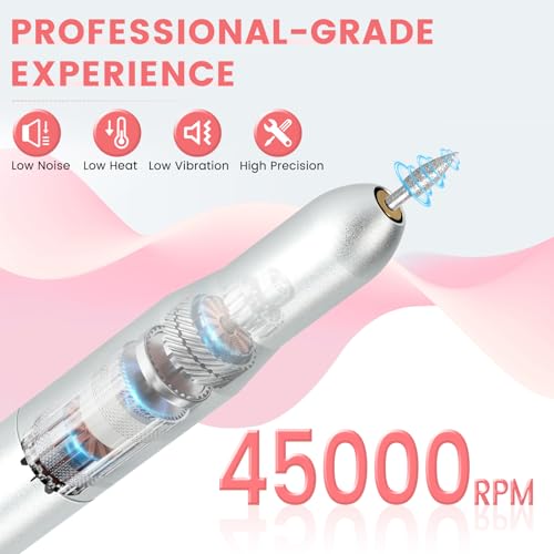 • Top-of-the-line Professional Equipment: Experience unmatched efficiency with our 45,000 RPM electric nail file motor;more fast in its class;designed for salon;high quality results in half the time. Great electric nail drill for both professional nail salon use and DIY your nails at home, enjoy nail beauty with your friends,Say goodbye to discomfort and hello to smoother, safer nail prep and polish removal
