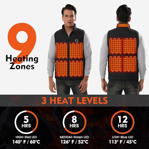 • ?9 HEATING ZONES AND 3 HEATING LEVELS?Designed for maximum warmth, this heated vest features 9 carbon fiber heating zones that target your neck, back, chest, abdomen, and waist. Easily switch between 3 temperature levels (113?F-140?F) to stay cozy in any outdoor condition.
