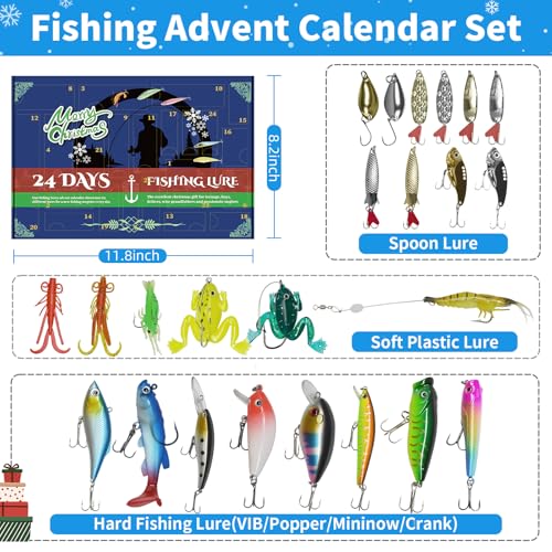 - Tailored for Every Fishing Scenario: The advent calendar features a diverse selection of lures, including soft plastic lures, Popper, Minnow, VIB, and more–perfect for any fishing condition. Whether you’re casting in calm lakes, rushing rivers, or open seas, this collection ensures you have the right bait to land your catch.