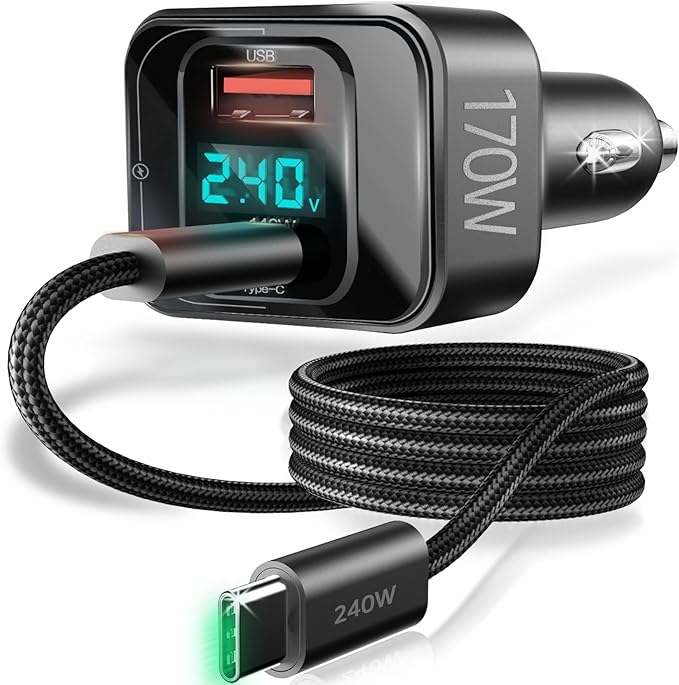 1×170W USB-C & USB-A car charger, 1×240W Type-C to C fast charging cable, Two-Year Replacement Guarantee.