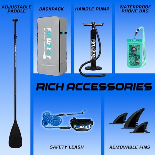 - ?Accessories Kit & Customer Service?FunWater SUP accessories include: adjustable paddle, fins, pump, backpack, waterproof phone bag, leash and repair kit. A complete set of accessories helps you conquer the waves more pleasantly. Funwater is committed to offering unparalleled customer service for all of the customers. If you have any questions about the paddle board, please feel free to contact us and we will do my best to solve the problem for you.