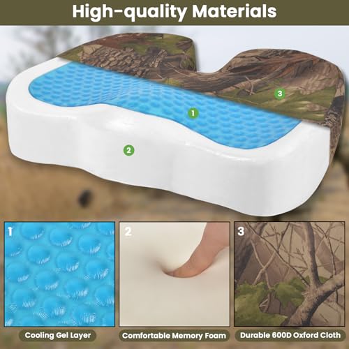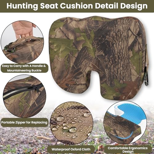 - UNIQUE GEL HUNTING SEAT CUSHION DESIGN – Our gel hunting seat cushion stands featuring a non-slip bottom to stay secure on tree stands, or cold/wet surfaces, even during extended hours of outdoor hunting. The compact size fits perfectly in treestands or blinds, while the contoured shape enhances comfortable sitting by supporting your posture. It integrates camo design that blends with forest environments, keeping you focused on hunting focus. Ideal for long hours of outdoor hunting.