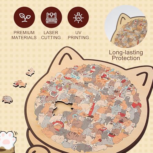 - [Discover a Purr-fectly Adorable Puzzle Experience]Immerse yourself in this 135-piece wooden jigsaw, where every piece is a delight! Uniquely shaped with charming cat silhouettes, playful paws, and cute poses, making the process of finding and fitting each piece a satisfying and joyful adventure.