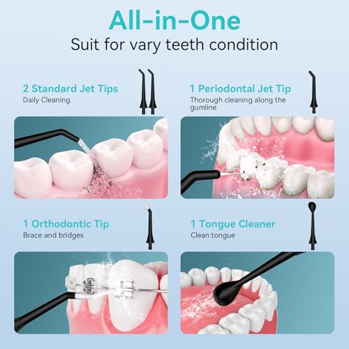 - 4 Specialized Nozzles & Dentist-Recommended:This water flosser comes with four specialized nozzles designed for comprehensive family oral care: two standard tips for daily use, one periodontal tip for sensitive gums, and one orthodontic tip for braces and bridges. Delivering a 360? deep clean that reaches areas traditional floss can’t, it is dentist-recommended and clinically proven to help prevent cavities, promote gum health, and maintain fresh breath all day
