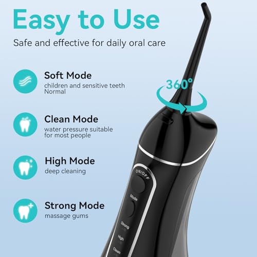 - 4 Customizable Modes for the Whole Family:Ideal for users of all ages, this cordless water flosser offers four adjustable pressure settings to suit individual needs–whether you have sensitive gums, braces, implants, or simply prefer a personalized clean. Modes include: Soft (for beginners and sensitive teeth), Clean (for daily comprehensive cleaning), High (for deeper cleaning), and Strong (for maximum power). It provides a thorough and gentle clean that surpasses traditional water flossers