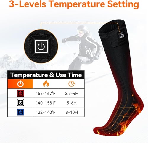 - ?3-Levels Temperature Controller? This heated socks is equipped with a convenient and easy-to-use 3-levels setting heat controller, which can adjust the adapted temperature according to your needs and stimulate your blood circulation. Whether you need a higher temperature to fight the severe cold, or just need a slight heating to keep comfortable, it can meet your needs.