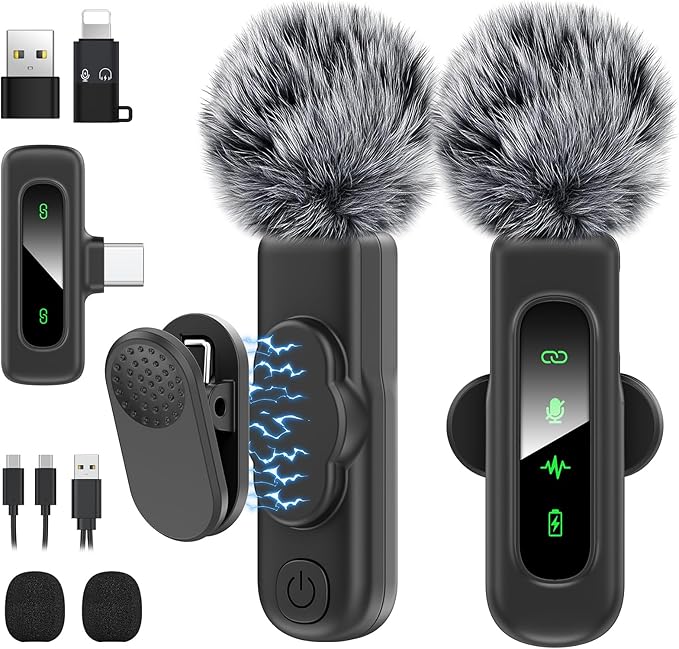 2 Wireless Lavalier Mics, 1 Receiver, USB-C to Lightning Adapter, USB Adapter, Charging Cable, 2 Foam Covers, 2 Furry Windscreens, User Manual.