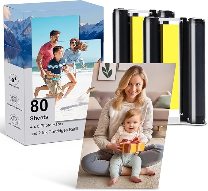 Set contains 2 color ink cartridges and 80 sheets of 4×6″ glossy photo paper (postcard size: 100 x 148 mm), compatible with Amber M100/M200 printers.