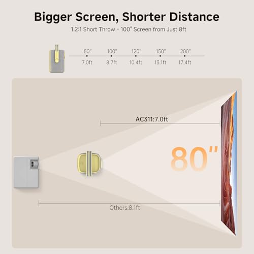 - [Small Space, Big Picture–1.1:1 Short Throw Ratio] As a true short throw projector, it’s designed for compact living–it projects a stunning 100-inch image from just 95inch/7.9 feet from the wall. Other standard projectors require distances exceeding 10 feet to project a 100″ image. This means you can place it on a compact coffee table or shelf, making it perfect for modern apartments, dorm rooms, and bedrooms where space is at a premium. [Note: The actual throw ratio is 1.1:1, not 1.2:1 as shown on the packaging.]