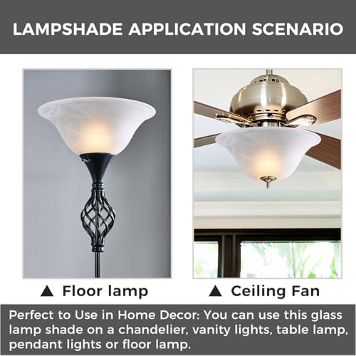 - Elegant and Durable Crafted with sturdy glass, this Alabaster glass lamp shade replacement is designed to add a touch of elegance and durability to your floor lamps,Torchiere Lamp,ceiling fan light,or standing lamp. Replacing your original ones with these frosted shades gives a more modern look and allows more light to shine through, which will definitely bring you a nice using experience.
