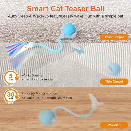 • ? Hunting-Style Cat Toy: Powered by a strong motor, this interactive cat ball toy moves swiftly across thick carpets, thin rugs, and hard floors. However, its speed on carpets is slightly slower than on hard surfaces. If you notice significantly reduced speed, please clean hair from the linkage as per the instructions.