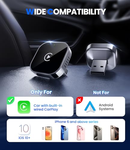 - ? Nur fur werkseitig kabelgebundene CarPlay-Fahrzeuge: Nicht kompatibel mit Fahrzeugen, die nicht bereits kabelgebundenes CarPlay unterstutzen. Funktioniert mit werkseitig installierten kabelgebundenen CarPlay-Systeme. Unterstutzt iPhones mit iOS 10 und hoher. Enthalt sowohl USB-A- als auch USB-C-Adapter, um die Kompatibilitat mit den meisten USB-Anschlussen im Auto zu gewahrleisten.