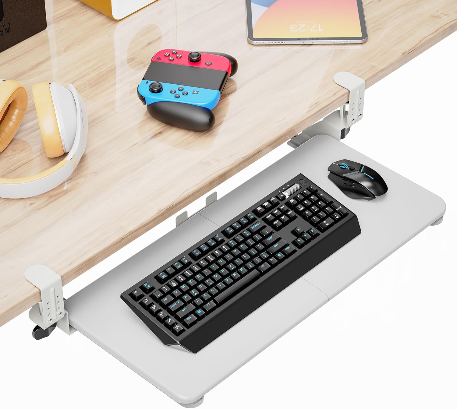 Spacious 25.6″x11.8″ tray (31.5″ with clamps) fits keyboard, mouse, and accessories.Reduces desk clutter and improves organization.Requires 31.5″ desk width for fit.