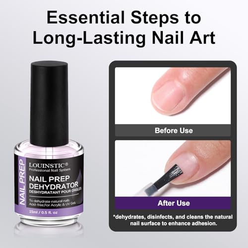 - ?Professional Nail Prep Dehydrator Base Coat?LOUINSTIC nail dehydrator is formulated to quickly remove oils, moisture and surface residue so polish and enhancements adhere better. Use this nail prep dehydrator before primer or base coat to create a clean, etched surface and a rock-solid foundation for gel, acrylic or press-on nails.