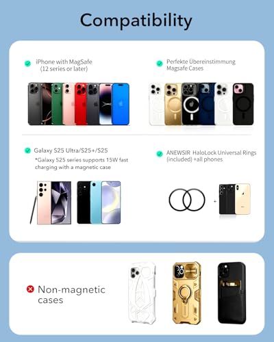 • ? Only for iPhone 12/13/14/15/16 Series & Fits MagSafe Case: ANEWSIR foldable phone ring holder is ONLY compatible with iPhone 16, 16 Plus, 16 Pro, 16 Pro Max, iPhone 15, 15 Plus, 15 Pro, 15 Pro Max, iPhone 14, 14 Plus, 14 Pro, 14 Pro Max, iPhone 13, 13 Pro, 13 Pro Max, 13 Mini, iPhone 12, 12 Pro, 12 Pro Max, 12 Mini with MagSafe Cases or No Case, ?NOTE?it will not stick other iPhone models or Non-Mag Safe Cases.
