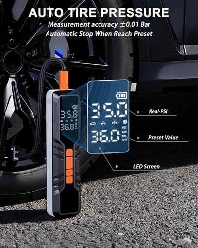 • ?Accurate Pressure Detection & Auto-Stop?Built-in digital pressure gauge and advanced smart chip provide precise real-time pressure monitoring. Simply preset the desired PSI and the inflator will automatically?Accurate Pressure Detection & Auto-Stop?Built-in digital pressure gauge and advanced smart chip provide precise real-time pressure monitoring. Simply preset the desired PSI and the inflator will automatically stop when the target is reached, preventing over-inflation and extending tire life. stop when the target is reached, preventing over-inflation and extending tire life.