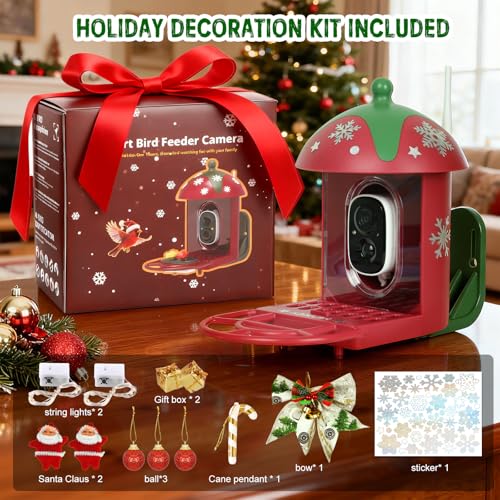 - Festive Christmas Decorations Included: Comes with decorative bow, snowflake stickers, LED lights, and Christmas ornaments–everything you need to decorate your smart bird feeder for the holidays. Hang the ornaments, add the festive bow and snowflakes, wrap the LED lights around your bird feeder to create a beautifully decorated holiday setup for the season