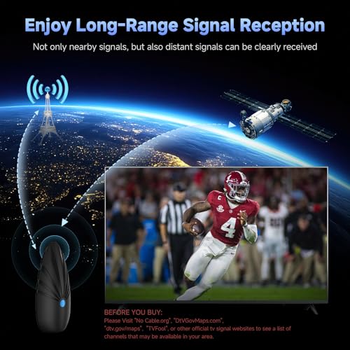 • ?360-Degree Signal Reception?The smart TV antenna indoor is equipped with high-quality coaxial cable, offering a reception range of up to 350+ miles. It allows for 360?signal reception, ensuring stable signals and providing moisture and lightning protection. You can enjoy clear images and high-quality sound anytime, anywhere, without geographical limitations. With a maximum cable length of 35 miles, you can use it in bedrooms, living rooms, outdoors, RVs, or tents, adding excitement to your life!