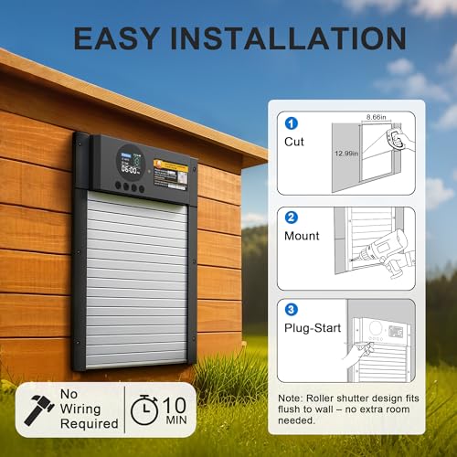 - ROLL-UP DESIGN – NO JAMMING IN WINTER-Unlike sliding doors that freeze or jam, this coop door features a roll-up design tested for 20,000+ cycles, delivering smooth operation in mud, snow, and harsh winters