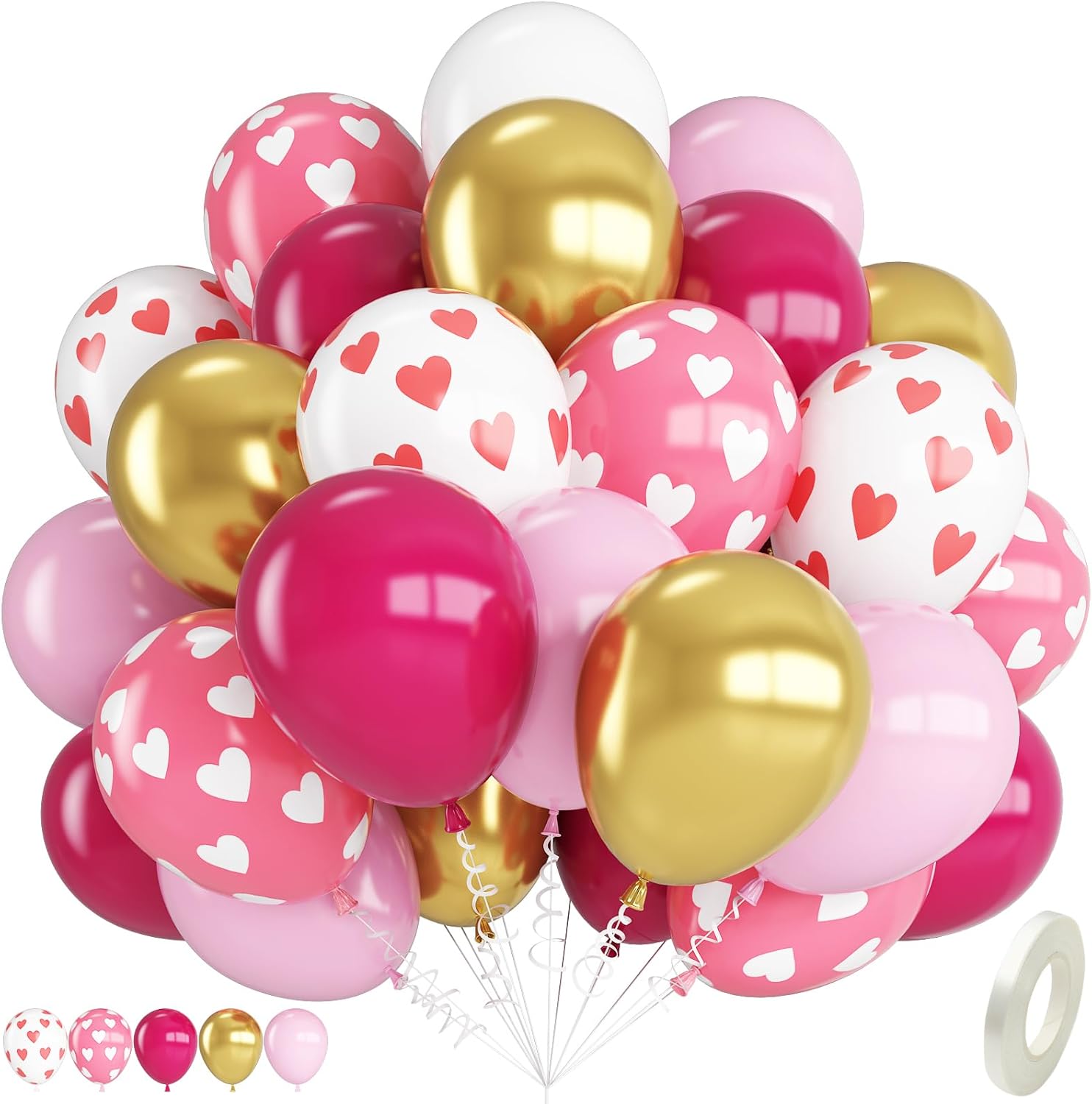 Includes matte hot pink, maca pink, metallic gold, and heart-printed balloons—ideal for arches, photo backdrops, or centerpieces.