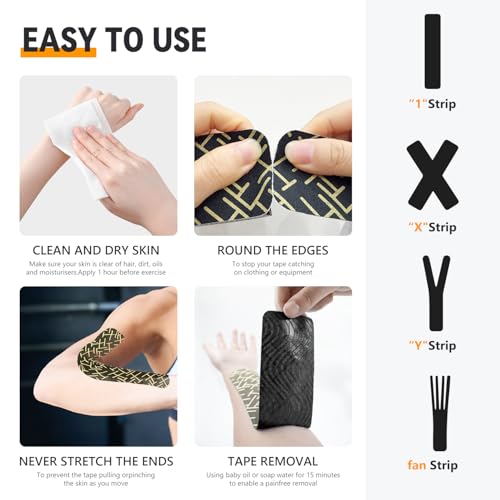 • ?Waterproof, Sweatproof & Long-Lasting Hold?? Made from breathable cotton and advanced adhesive, our kinesiology tape stays on during showers, workouts, or even swimming. This durable elastic sports tape keeps your tissue site supported under any condition. Please note that the skin should be clean and dry before using the bandage, do not apply moisturizer or essential oils, and if there is too much body hair, it is recommended to shave it off to avoid affecting the adhesion effect and causing pain when tearing off