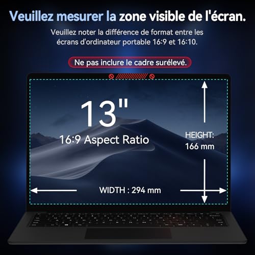 • ?Dimensions du privacy screen 13.3 pouces 16:9?Veuillez mesurer et confirmer la zone d’image qui peut etre affichee sur l’ecran de l’ordinateur portable avant de passer une commande. Largeur : 11,6″ (294 mm), Hauteur : 6,5″ (166 mm), Diagonale : 13.3″ (337,8 mm).Il n’est pas recommande de selectionner une taille basee uniquement sur la diagonale.Compatible avec toutes les marques, y compris Lenovo, Dell, HP, Asus, Samsung, Acer et autres, qui repondent aux dimensions specifiees.