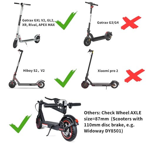 - Wide Compatibility: Perfect fit for Gotrax GXL V2, GL2, XR, Rival, APEX MAX; Hiboy S2 V2; Widoway DY8501; Xiaomi M365/1S. For other models, check for 87mm axle, 8.5” tire, and 110mm disc brake.