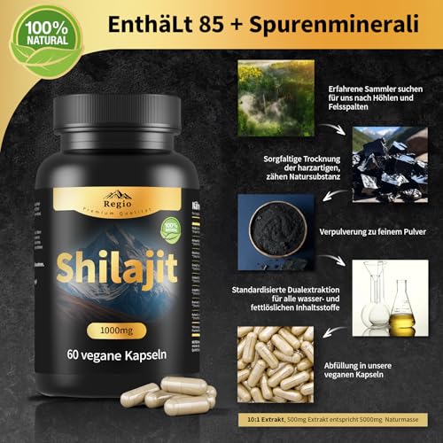 - ? Naturlich reich an Mineralien & Vitalstoffen Mit uber 85 Spurenelementen, Fulvo- und Huminsauren liefert Shilajit eine naturliche Kombination aus Nahrstoffen, die den Stoffwechsel unterstutzen, die Zellregeneration fordern und die Aufnahme von Vitaminen verbessern. Diese Synergie hilft, Mudigkeit zu reduzieren, Konzentration zu steigern und das allgemeine Wohlbefinden nachhaltig zu verbessern.
