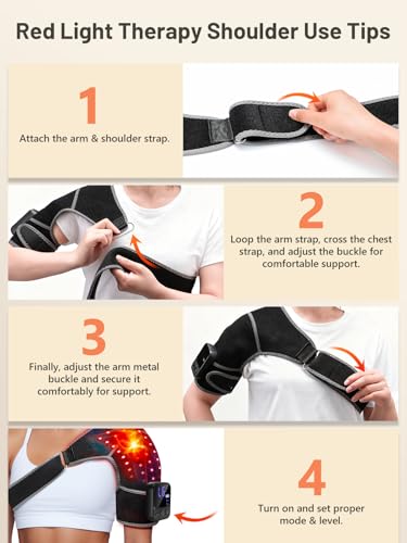 - Red Light Therapy for Shoulder: This advanced shoulder wrap features 72 precision lamp beads, each emitting both dual 660nm red light and invisible 850nm near-infrared wavelengths. The 660nm red light works with surface tissues to help ease shoulder discomfort and tension, while the 850nm near-infrared wavelengths reach deeper into muscle and joint areas, supporting the release of stiffness and promoting comfortable mobility.