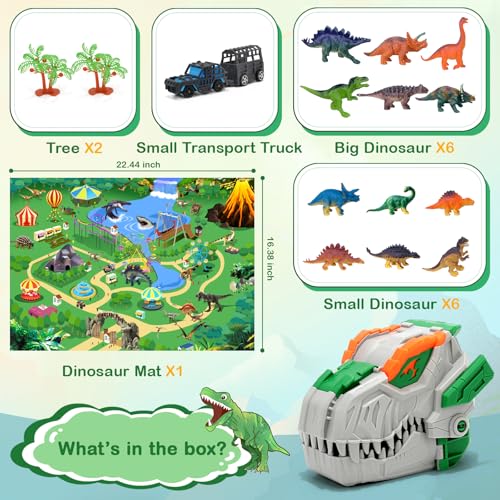 • Complete Dinosaur Playset – Includes 12 realistic dinosaur figures, a detachable dinosaur head that transforms into a scene, a 2-part transport truck, a dinosaur park map, and 2 trees. Each dinosaur is brightly colored, highly detailed, and varied in species, making this dinosaur toy set perfect for sparking kids’ imagination.