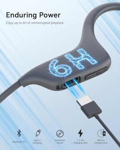 • USB-C Charging: Never worry about power drainage during your day. These bone conduction earbuds offer up to 6-8 hours of continuous playback on a single charge. The USB-C universal charging interface meets the needs of more users. The running headphones also feature a 240-hour standby mode, making them ready for use whenever you need them. Perfect for long training, travel, or daily commutes