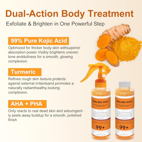 • GENTLE EXFOLIATION: This kojic acid turmeric spray gently removes dead skin and impurities, revealing smoother skin without irritation. Ideal for daily keratin care and body rejuvenation