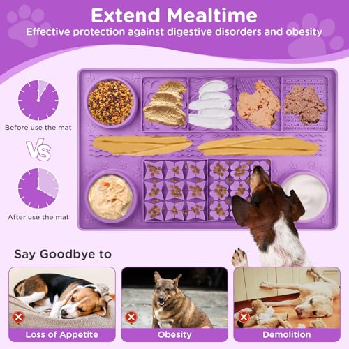 • [Extra Large and Multi-Functional Design] This oversized licking pad measures 31.5 inches by 20 inches and is suitable for small, medium and large dogs. Our snuffle mat for dogs features multiple functional zones, including the water bowl area, dry food area, wet food area and slow food area, meeting all the dietary needs of pets. It is also applicable to families with multiple dogs.