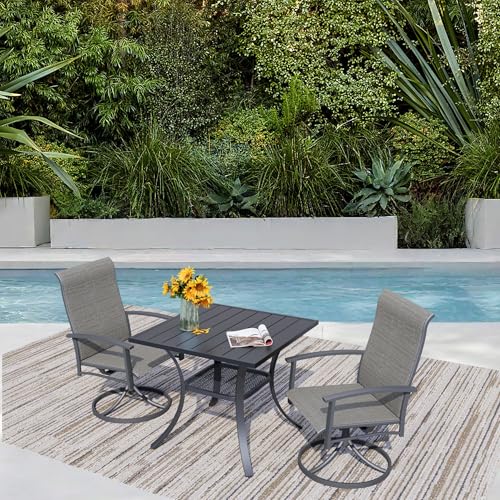 - Durable & Sturdy The patio chairs and table set is made of premium metal steel with E-coating, so it is more sturdy and rust-resistant. The patio Swivel chairs holds up to 330 lbs weight capacity for long-lasting use
