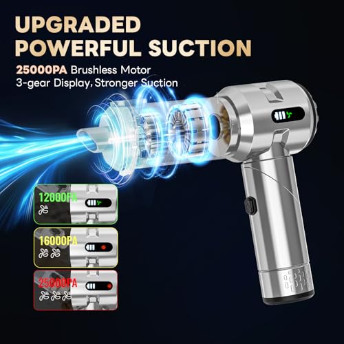 - ?Strong Suction Power?:It has 25000PA suction power, which is twice that of ordinary handheld vacuum cleaners. Suitable for cleaning sliding door tracks, windows, drawers, computer hosts, car doors, sofas, keyboards, sewing machines, pianos, etc. And the upgraded vacuum cleaner has a longer battery life, allowing for extended use on a single charge.