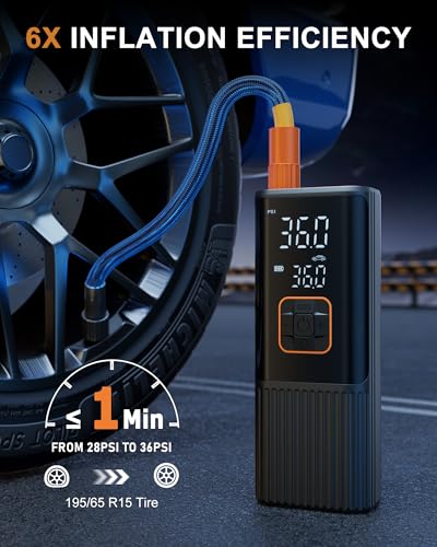 - 6X Faster Inflation:Experience industry-leading speed with a 25,000 RPM motor and advanced pump core–delivering air 6X faster than standard tire inflator. Reach a maximum pressure of 180 PSI and inflate a car tire from 28 PSI to 36 PSI in just 1 minute. Perfect for road trips and everyday use.