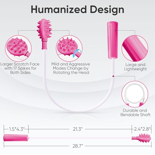 - ?Innovative Ergonomic Design?28.7″ extra long curved, extendable, and flexible shaft provides strong support. It can be bent to any angle, easily reach the entire back without much effort, even those hard-to-reach itches. 2.8″ large 360? rotatable scratching head with two modes: Gentle massage for sensitive skin and aggressive mode relieving intense itching. The spikes are smooth and will not hurt the skin. The wider handle provides a more comfortable grip for long-term use without getting tired